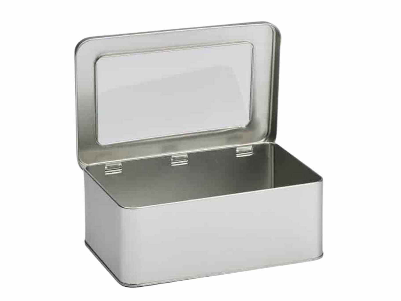 Diese großzügige Fensterdose mit Scharnierdeckel aus silbernem Weißblech ist die ideale Verpackung für Kekse, Gebäck, Süßwaren oder kleine Geschenksets. Das große Sichtfenster im Deckel ermöglicht einen direkten Blick auf den Inhalt – ideal zur Präsentation im Regal, auf Messen oder im Ladengeschäft.