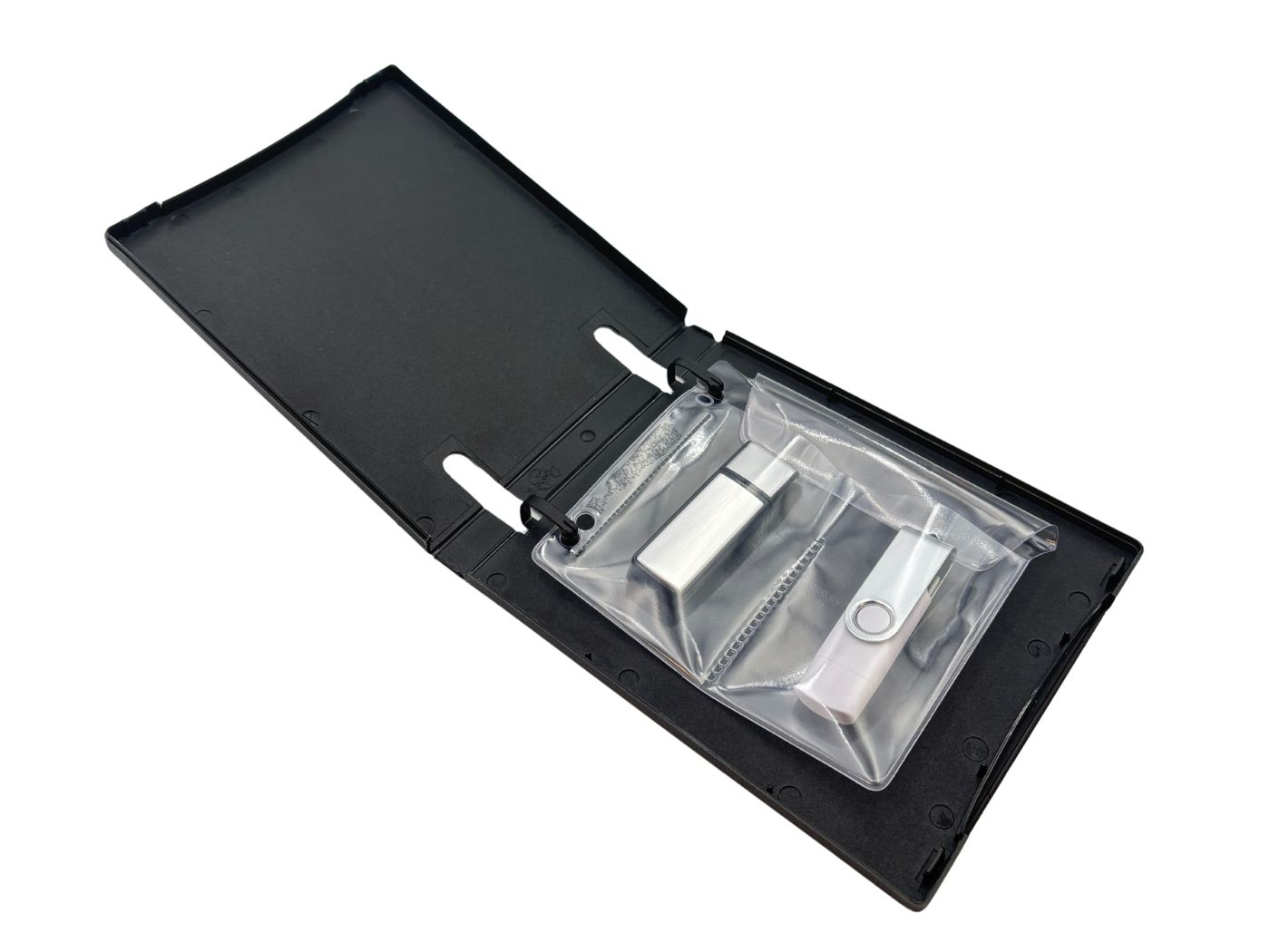 - Der transparente Einleger hat zwei Fächer für bis zu 2 USB Sticks oder eine Visitenkarte & einen USB Stick